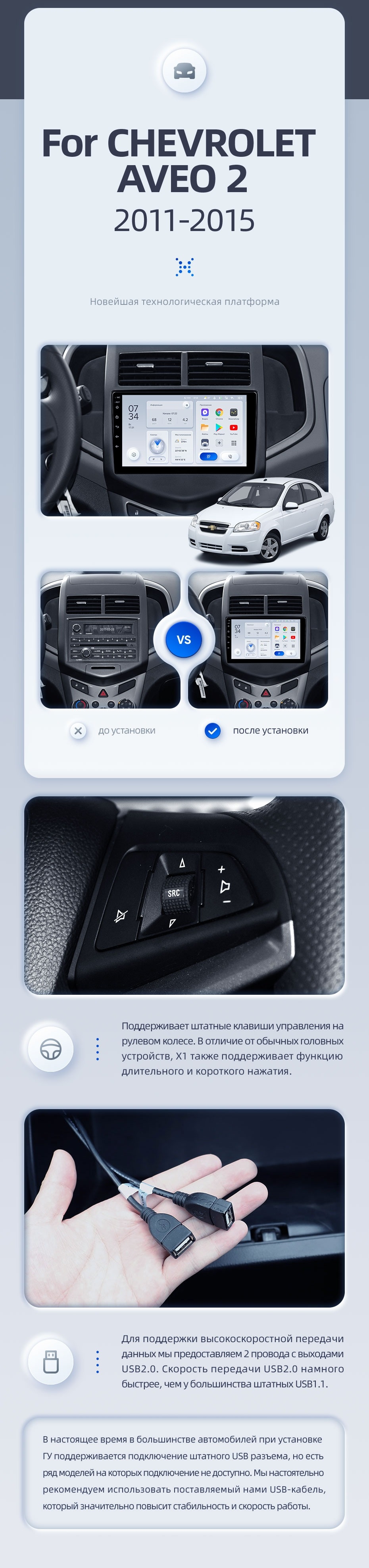 | USB | 3×USB 2.0 + USB 3.0 | Доп. аксессуары | Передняя/задняя AHD-камера, DVR-регистратор, TPMS, парковочный OBD, Type-C → HDMI |