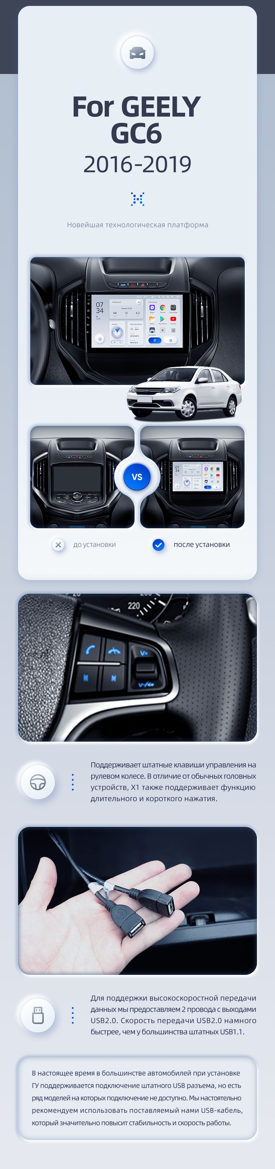 | USB | 3×USB 2.0 + USB 3.0 | Доп. аксессуары | Передняя/задняя AHD-камера, DVR-регистратор, TPMS, парковочный OBD, Type-C → HDMI |