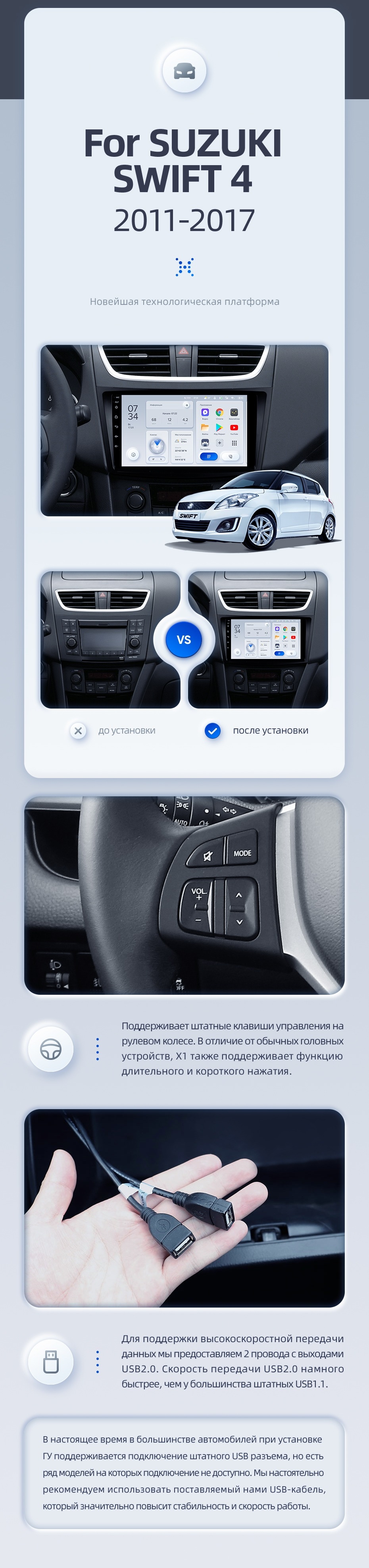| USB | 3×USB 2.0 + USB 3.0 | Доп. аксессуары | Передняя/задняя AHD-камера, DVR-регистратор, TPMS, парковочный OBD, Type-C → HDMI |