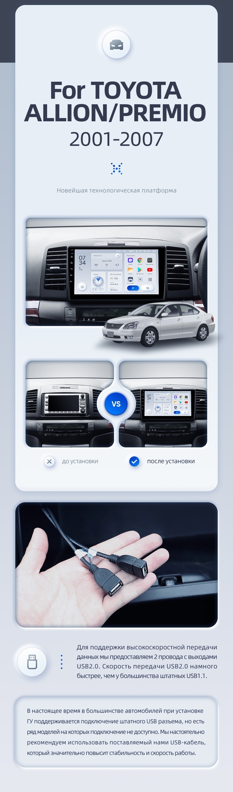 | USB | 3×USB 2.0 + USB 3.0 | Доп. аксессуары | Передняя/задняя AHD-камера, DVR-регистратор, TPMS, парковочный OBD, Type-C → HDMI |
