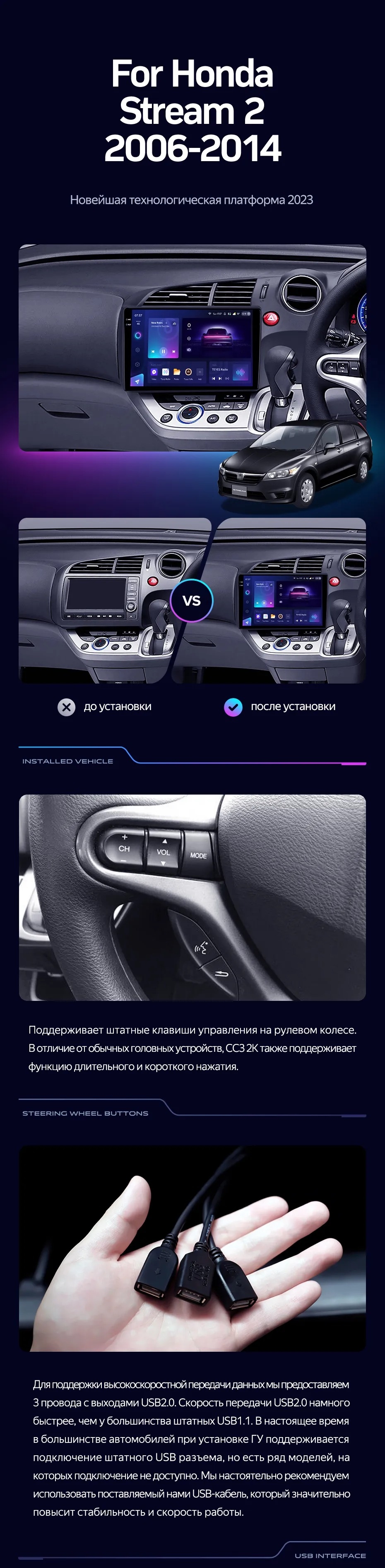 Полный комплект установки магнитолы Teyes с рамкой и проводкой можно выбрать в каталоге штатных магнитол Honda Stream 2 (2006-2014).