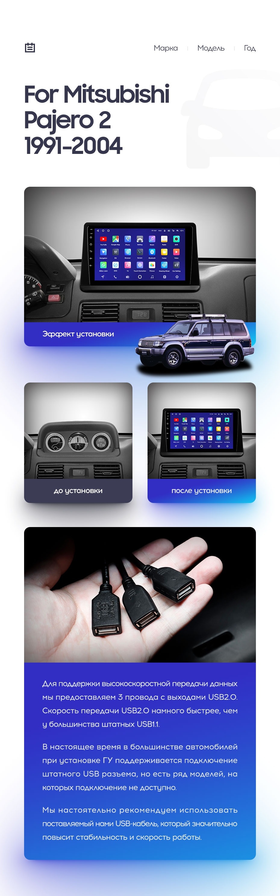 Установочный комплект для Mitsubishi Pajero 2 (1991-2004) включает переходную рамку и проводку.