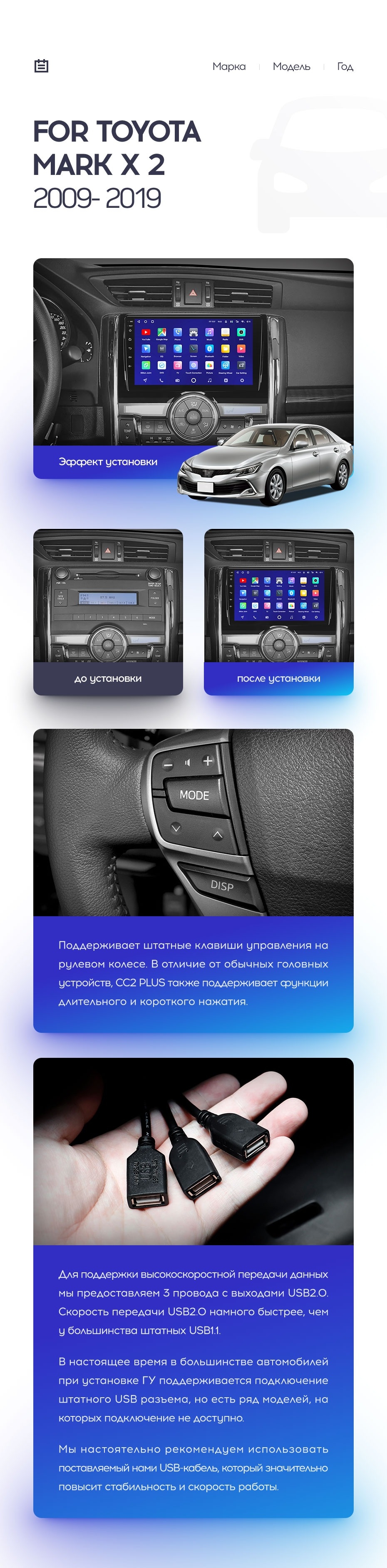 Полный комплект установки магнитолы Teyes с рамкой и проводкой можно выбрать в каталоге штатных магнитол Toyota Mark X 2 X130 (2009-2020).