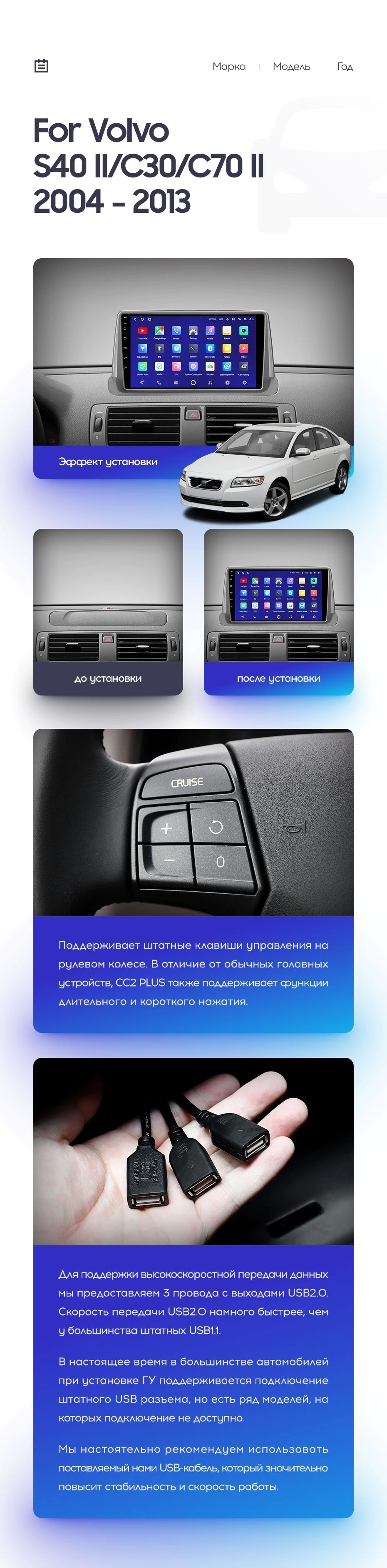 Полный комплект установки магнитолы Teyes с рамкой и проводкой можно выбрать в каталоге штатных магнитол Volvo C30 (2006-2013).