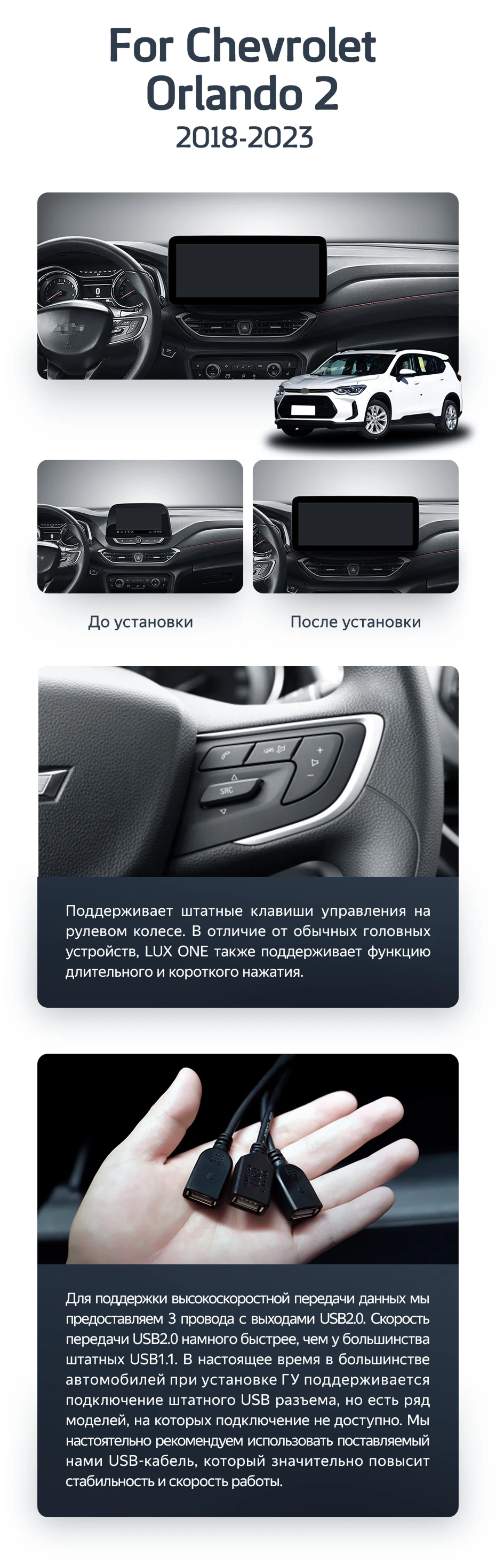 Установочный комплект для Chevrolet Orlando 2 (2018-2023) включает переходную рамку и проводку.