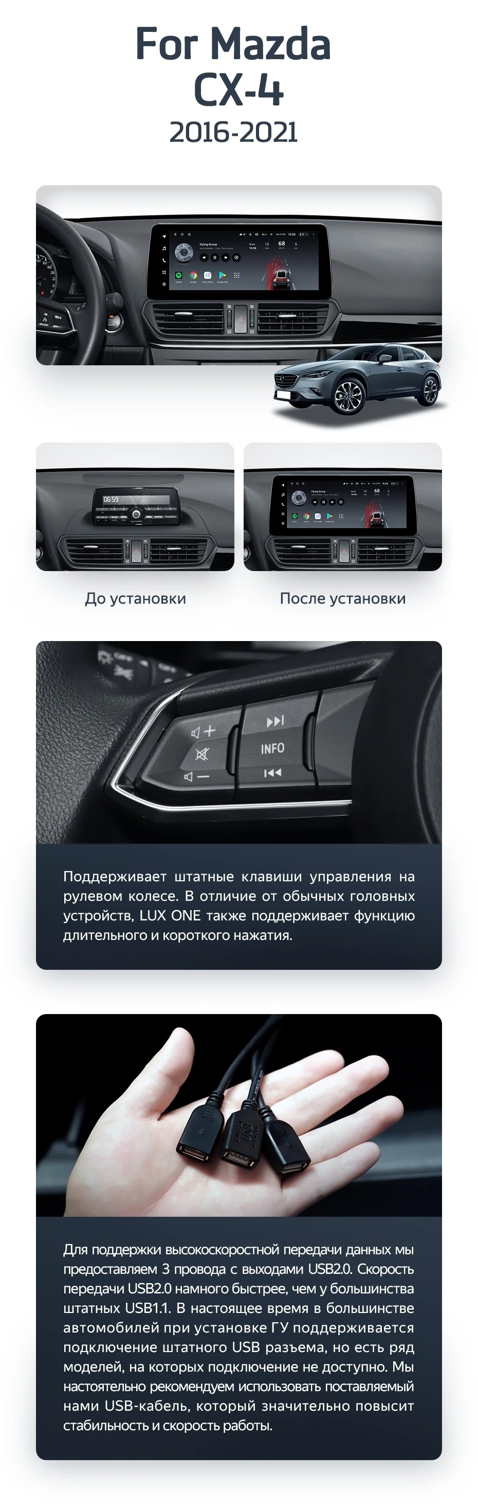 Полный комплект установки магнитолы Teyes с рамкой и проводкой можно выбрать в каталоге штатных магнитол Mazda CX-4 (2016-2021).